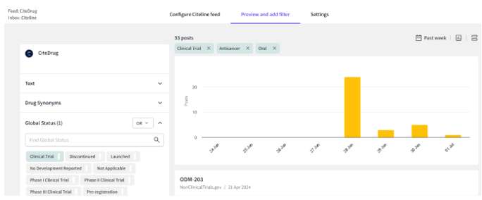To connect a Citeline Drugs feed to your Inbox, follow these steps: