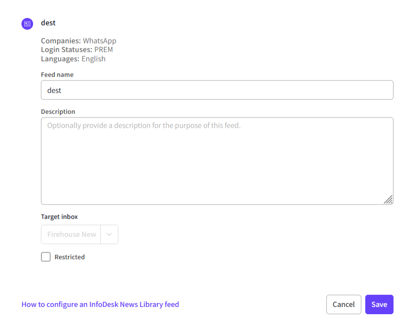 - On the Settings page you can change the name and description of your updated feed and select another target inbox.