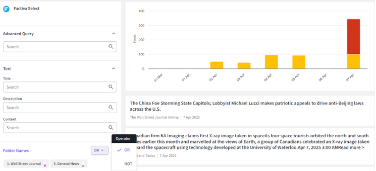 These options include free text search, Advanced Query and Factiva specific filters. Most of the filters provide predefined facet options that you can select from to specify your filter. Note that filters and facets are only enabled when content matches the filters.