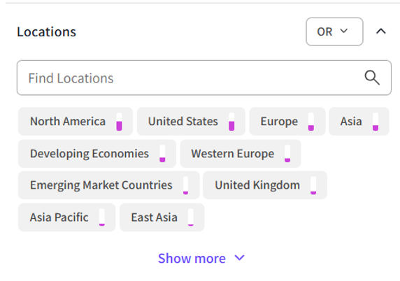 Locations: Search by Location names or use the predefined facets to filter. Click on “Show more” to view all the options.