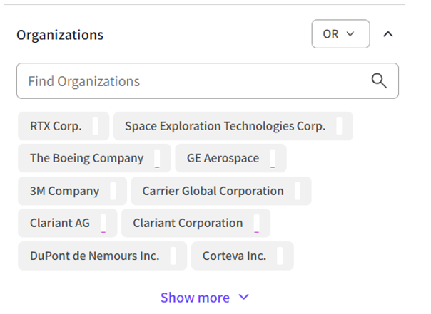 Organizations: Search Organization names or use the predefined Organization facets to filter by company. Click on “Show more” to view all the options. Use this filter to delimit the filter to specific organizations