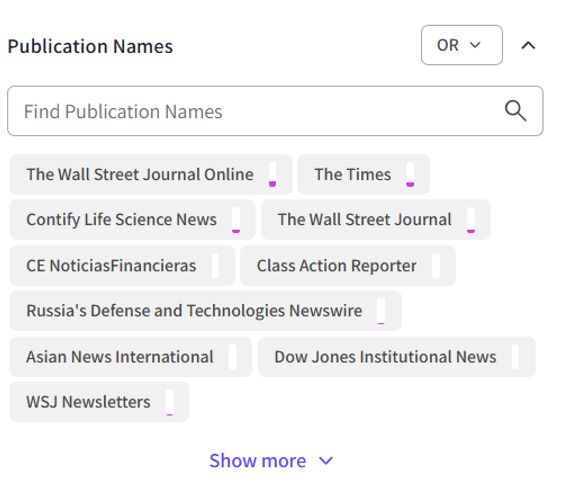Publication Names: Search Publication names or use the predefined Publication facets to filter by company. Click on “Show more” to view all the options. Use this filter to delimit the filter to specific Publications.