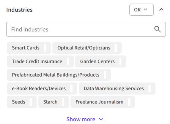 Industries : Search industry or use the predefined industry facets to filter by industry. Click on “Show more” to view all the options. This filter is commonly used and a good start when creating a filter