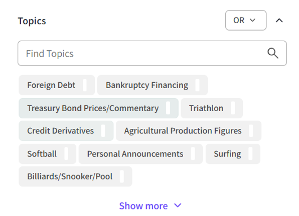 Topics: Search Topic names or use the predefined Topic facets to filter by company. Click on “Show more” to view all the options. Use this filter to delimit the filter to specific topics.