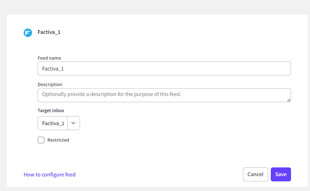 - On the create page, you can change the name and description of your updated feed and select another target inbox.