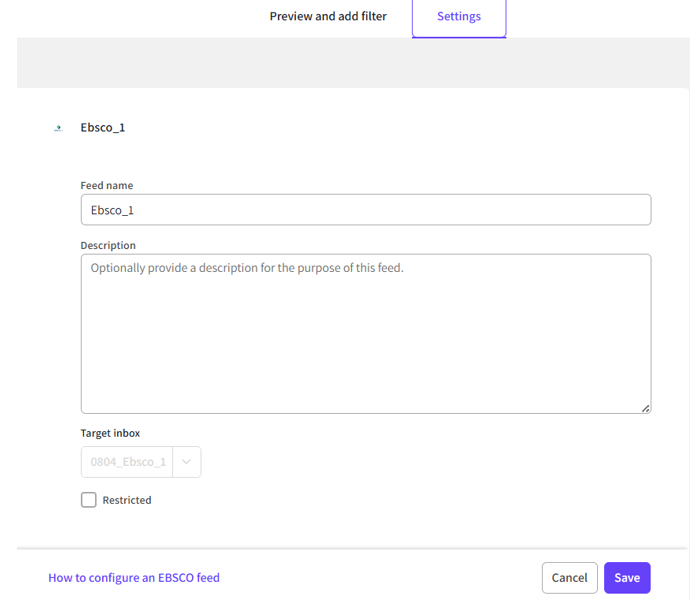 - Alternatively, click the New Feed button on the connectors tile to go to the Preview and Add Filter page, where you can apply filters to select specific content from EBSCO.