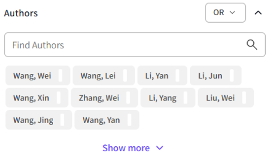 Authors: Search for authors or use the predefined author facets to filter by. Click "Show more" to view all options.