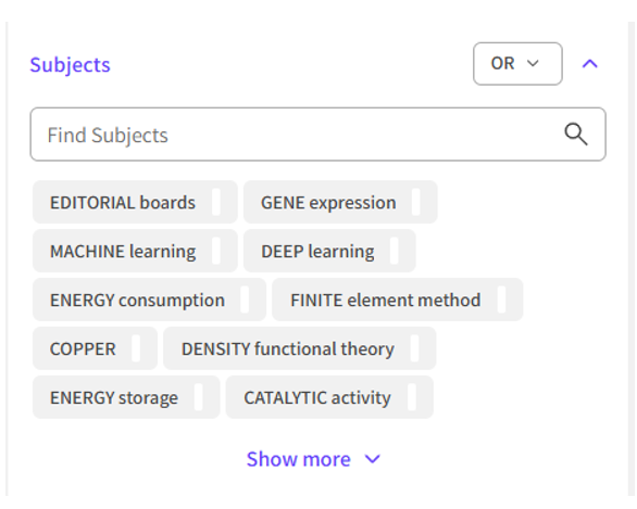 Subjects: Search for subjects or use the predefined subjects facets to filter by. Click "Show more" to view all options.