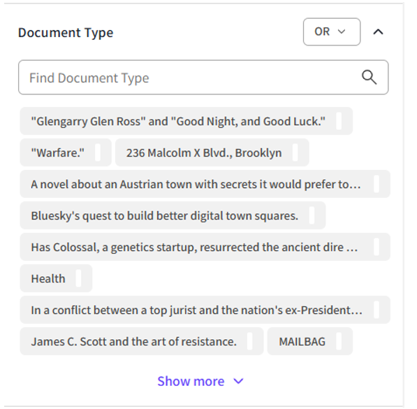 Document Type: Search for document type or use the predefined publication type facets to filter by. Click "Show more" to view all options.