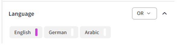 - Use the OR operator to include one or the other facet within a filter category. This gives a wide search.