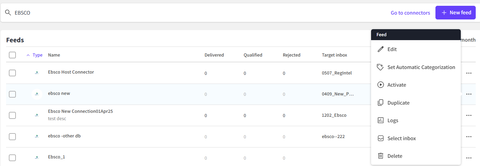 - Click the New Feed button and select the EBSCO feed in the drop-down menu.