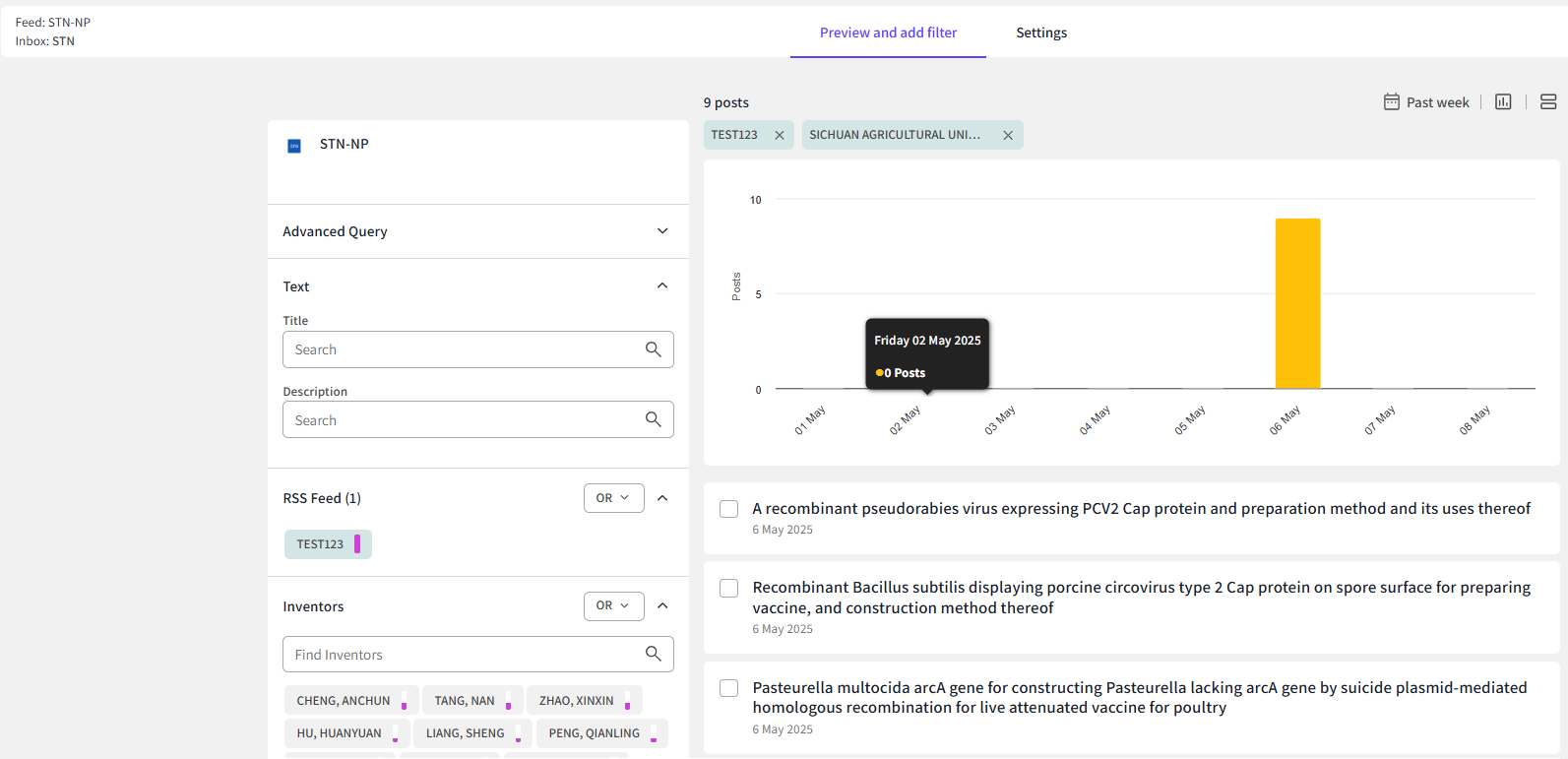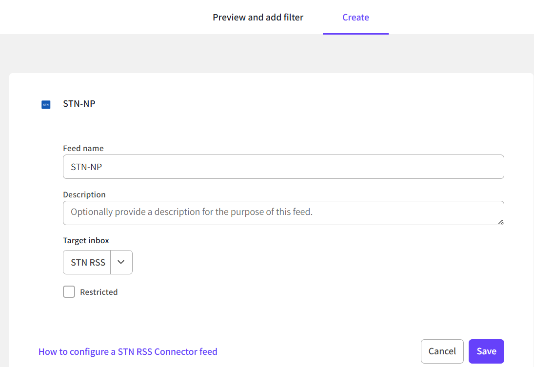 - Alternatively, click the New Feed button on the connectors tile to go to the Preview and Add Filter page, where you can apply filters to select specific content from STN.