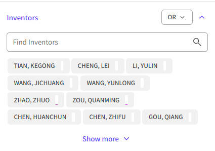 Inventors: Search by the Inventors or use the predefined facets to filter by Inventors. Click on “Show more” to view all the options.