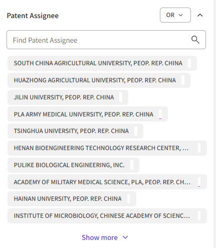 Patent Assignee: Search by the Patent assignee or use the predefined facets to filter by Patent assignee. Click on “Show more” to view all the options.