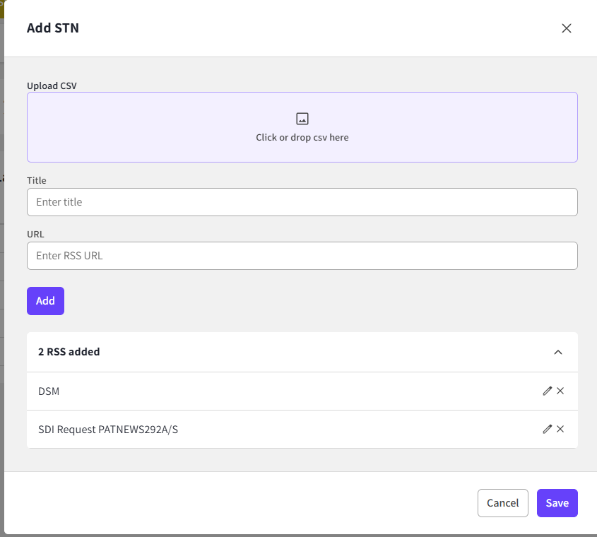The New STN screen allows you to add and manage your list of STN RSS feed URLs. Use this screen to set up new RSS feeds for your STN integration.