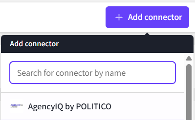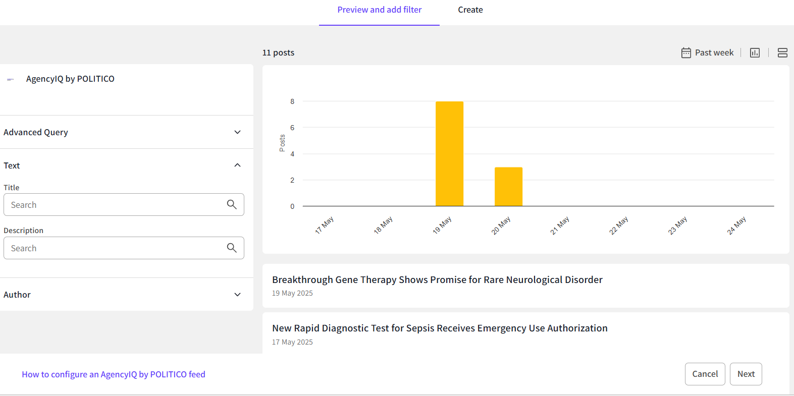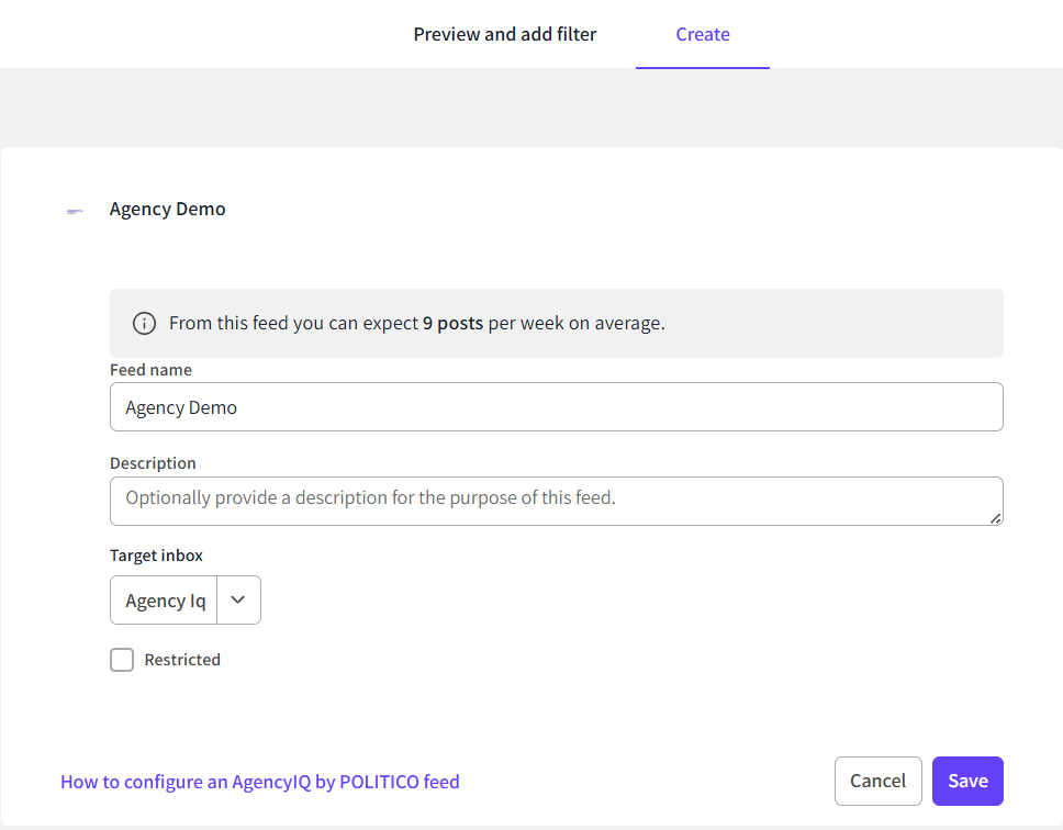 - Alternatively, click the New Feed button on the connectors tile to go to the Preview and Add Filter page, where you can apply filters to select specific content from AgencyIQ by POLITICO.