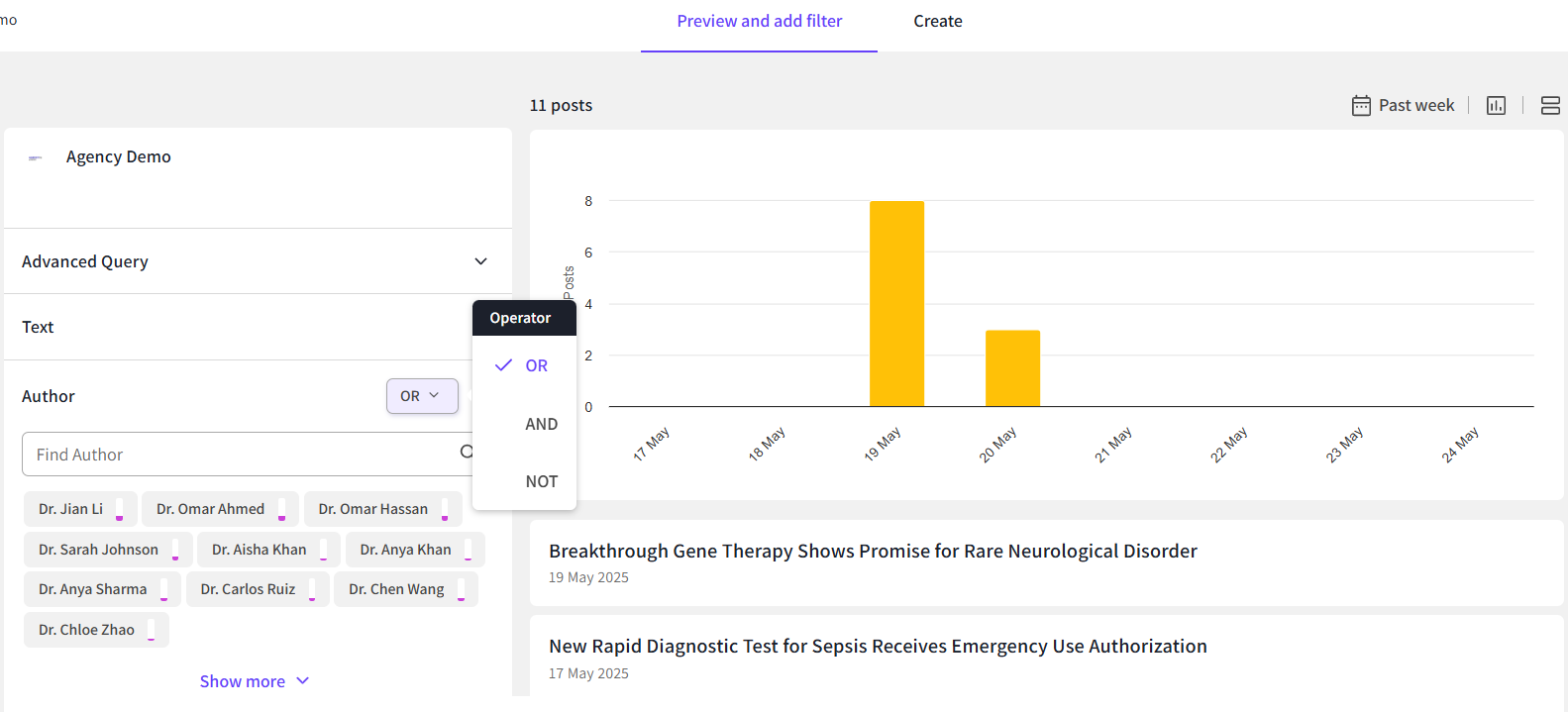 The list of posts that appears when you add filters allows you to preview the filters before applying them. Review the preview post list to ensure that the posts retrieved by the filter meet your expectations.