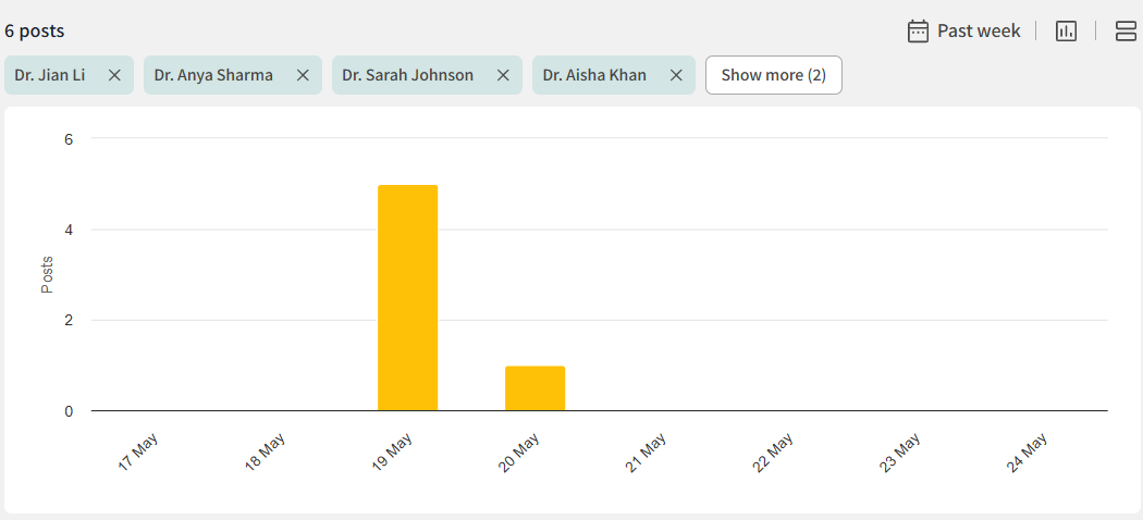 If the post list view is empty, no content matches your search within the set time period or filters. Change the Time period or adjust the filters and preview the result. The default period is “Past week”.