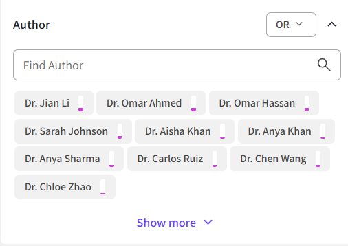 Author: Search by the Author or use the predefined facets to filter by Author. Click on “Show more” to view all the options.