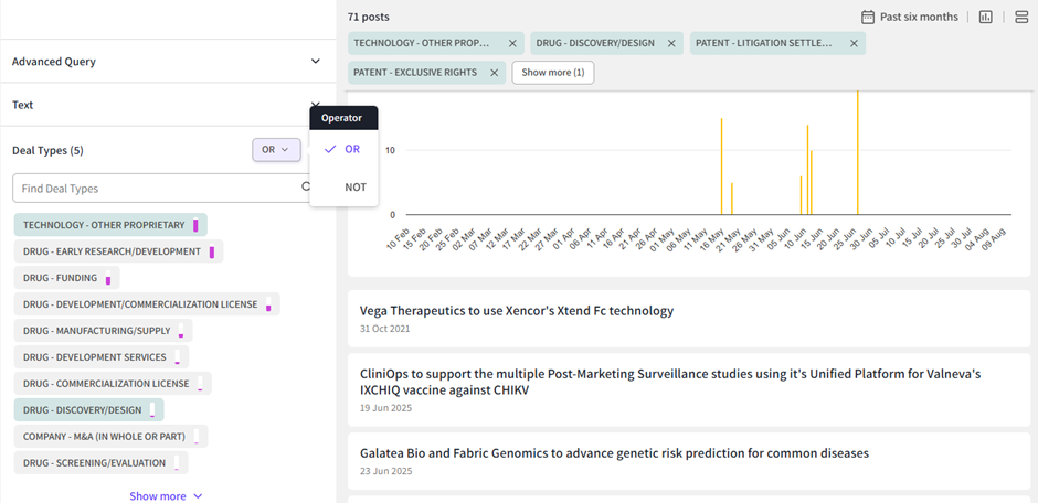 We recommend that you start by adding a text query (one or several keywords or a search string) in the Title + Description text bars in combination with the Indication Group Name filter.