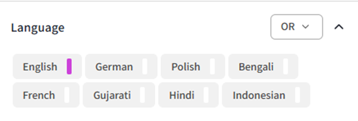 Language: Search by language or use predefined facets to filter, use NOT to exclude, select one or several, note preview list empties if no content in selected language.