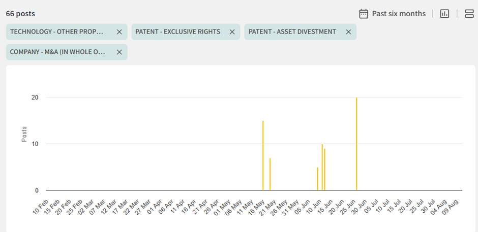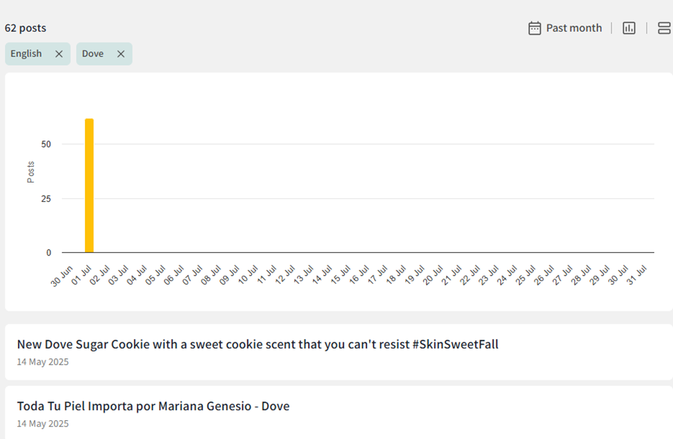 The chart above the post list displays the number of retrieved posts within the specified Time period, providing an estimate of the amount of information your feed will generate over time. You can change the time period by clicking the Calendar button above the chart.