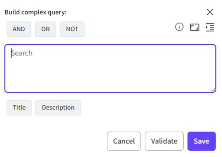 The Text filter allows for free text searches. You can use a single keyword, combine several keywords, or create a complete search string.