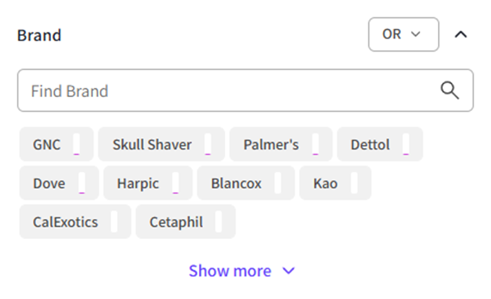 Brand: Search by brand or use predefined facets to filter, use NOT to exclude, select one or several, click “Show more” for options, note preview list empties if no content from selected brand.