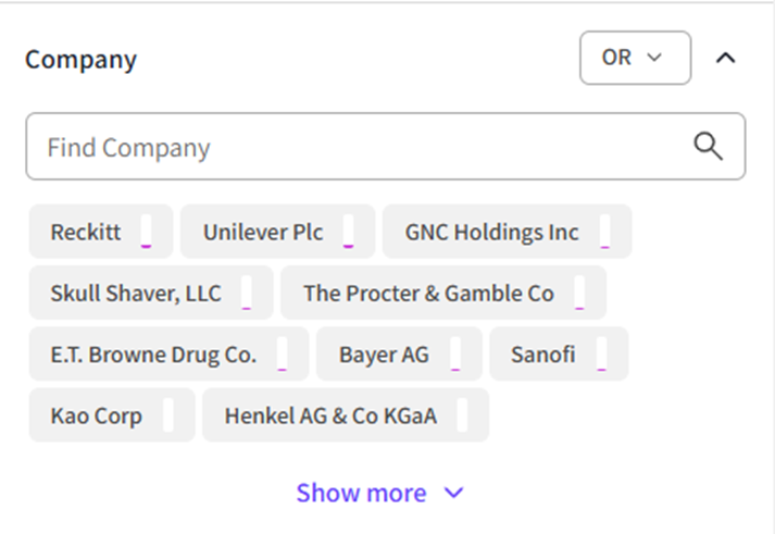 Company: Search by company or use predefined facets to filter, use NOT to exclude, select one or several, click “Show more” for options, note preview list empties if no content from selected company.