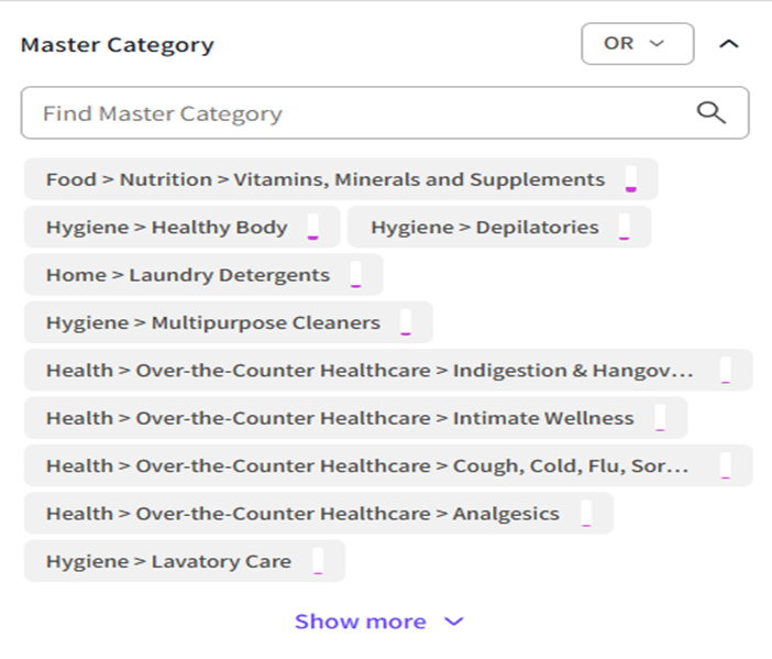 Master Category: Search by master category or use predefined facets to filter, use NOT to exclude, select one or several, click “Show more” for options, note preview list empties if no content from selected master category.