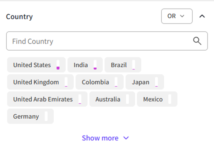 Country: Search by country or use predefined facets to filter, use NOT to exclude, select one or several, click “Show more” for options, note preview list empties if no content from selected country.