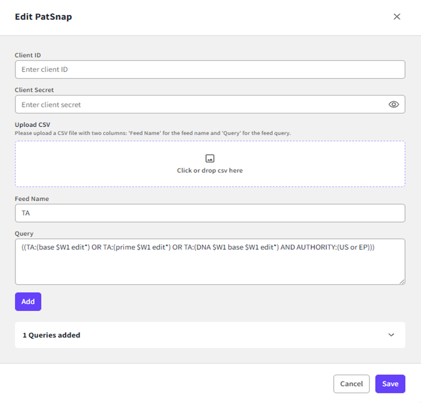 Once all queries are added, click Save to save your Patsnap configuration, or Cancel to discard changes.
