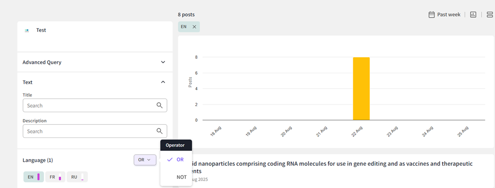 These options include free text search, Advanced Query, and Patsnap-specific filters. Most of the filters provide predefined facet options that you can select from to specify your filter. Note that filters and facets are only enabled when content matches the filters.